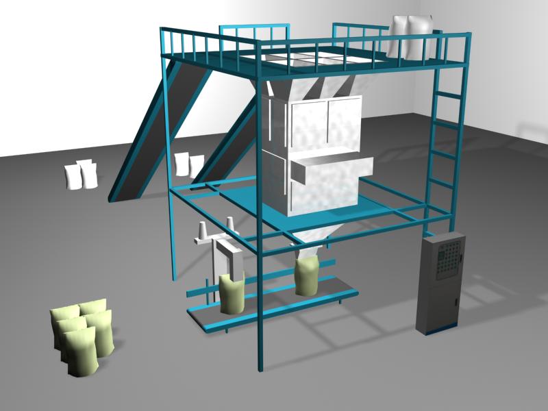 上料皮帶機、秤體支架、原料儲料倉、原料給料系統、計量系統、攪拌系統、包裝系統、縫包系統